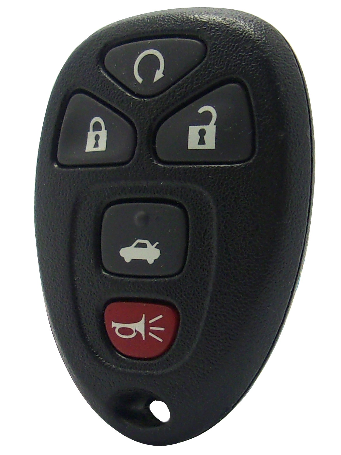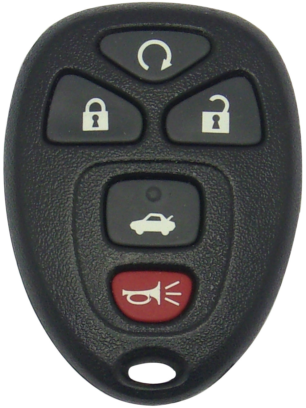 Features 5-buttons: LOCK, UNLOCK, TRUNK, REMOTE START, and PANIC buttons.