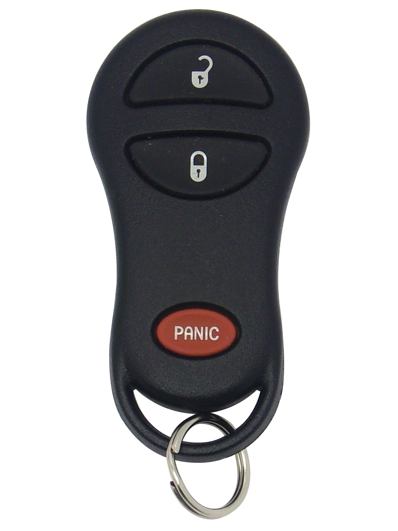 Features three button functions: LOCK, UNLOCK, and PANIC.