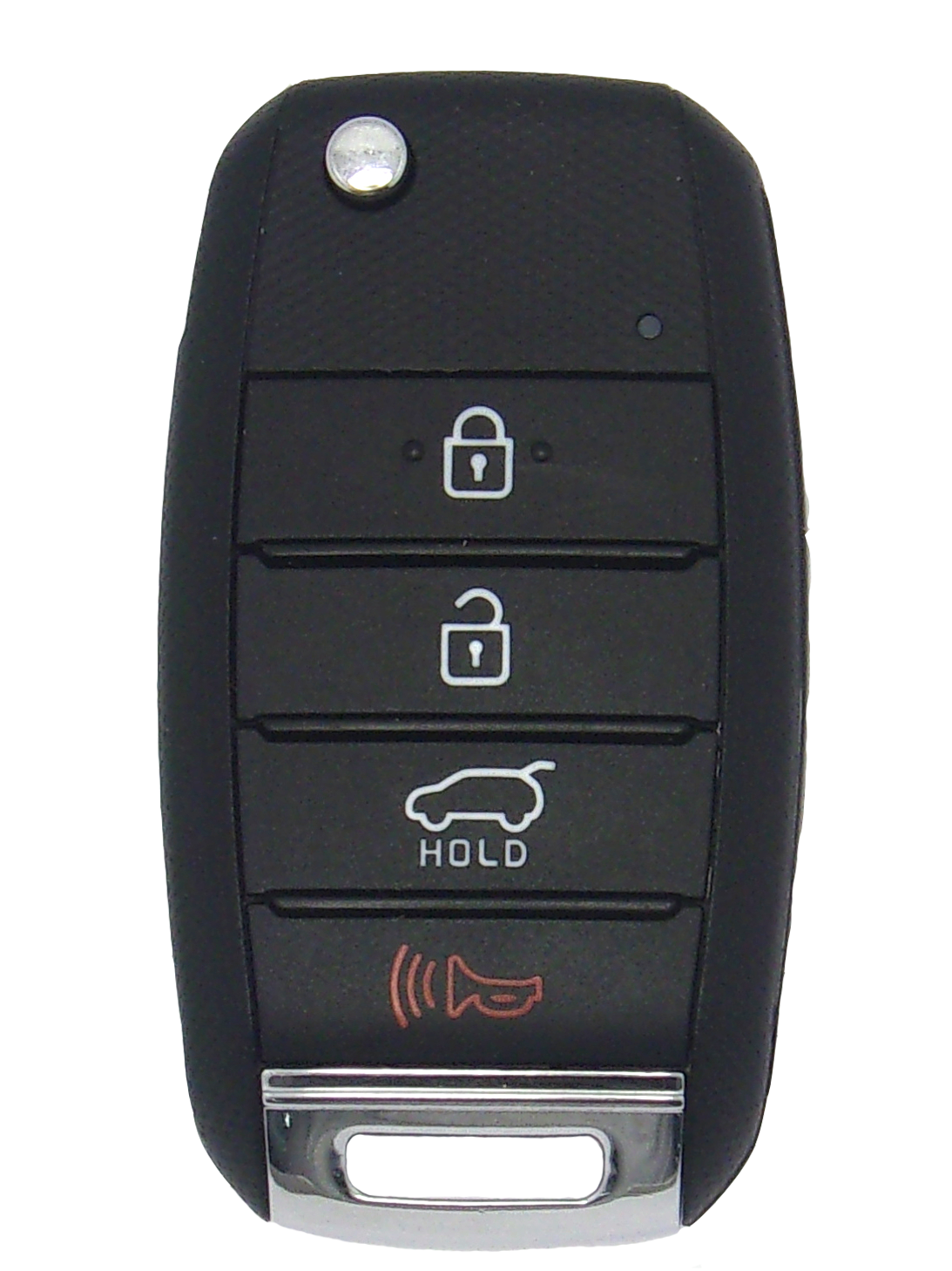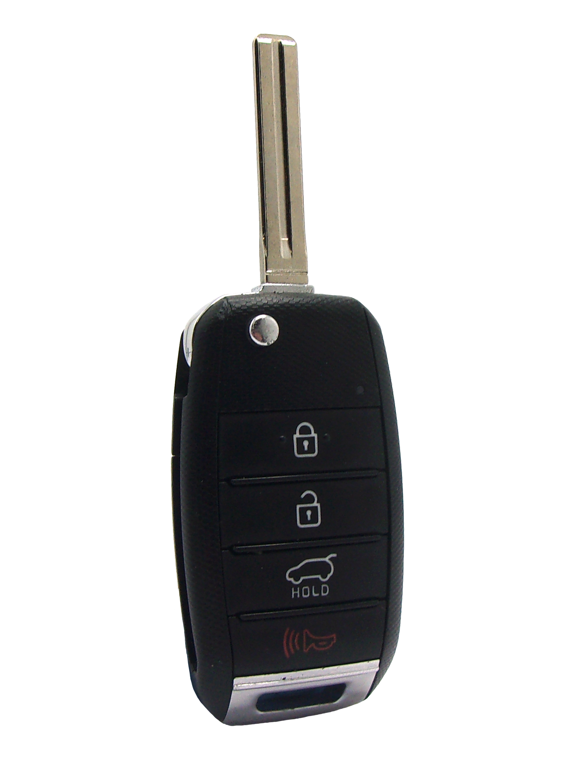 This unique product is a “switchblade” style remote + key combo unit. There are four buttons: Lock, Unlock, Rear Hatch and Panic. It performs two functions: It works as a key AND a keyless entry remote. With the press of the silver button, the hidden keyblade is spring-released, automatically locking into the useful position. Press the button again so you can press the blade back into it’s hidden position.